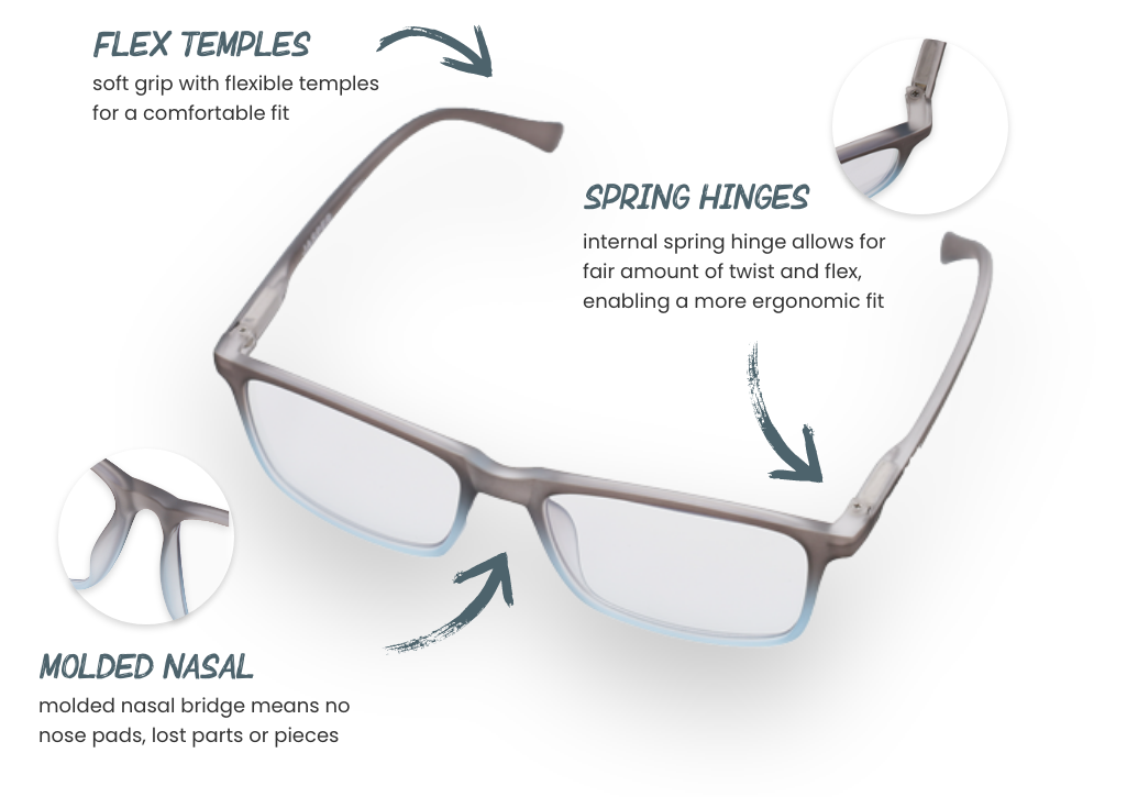 Spring Hinges | Ultra Flex 360º Hinges | Molded Nasal | Comfort Touch Composite | Soft Touch TPE Construcion | TR Adjustable Temples |